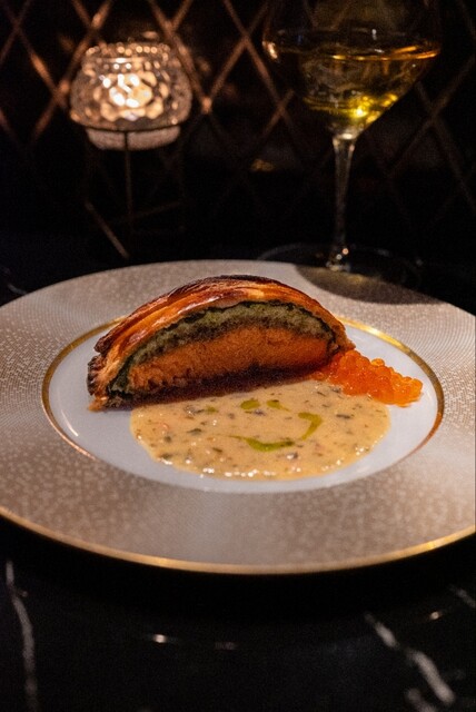 ナイフを入れると、パイの中からふわりと広がる香り。ホタテのムースがサーモンを包み込み、添えられたマリネいくらの塩気がアクセントに。食感の色彩が豊かで、丁寧に作られた仕事ぶりが伝わってきます。