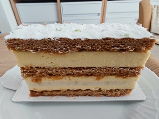 パイナップルのムースリーヌにトロピカルなライム、ココナッツ、バナナのジュレをサンドした夏のミルフィーユ