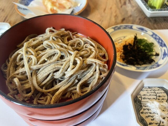 島根の辛口おすすめの超王祿をいただきながら、お昼のコースをいただきました。お二人の優しさがお料理にもあらわれて、胃も喜ぶお料理ばかり。チーズのお味噌和えが出てきた時はつい月山をお代わり。出来立ての天ぷらをいただき、3枚のそばは風味歯応え喉越しも最高です。最後は蕎麦湯とデザートで心も満たされました。