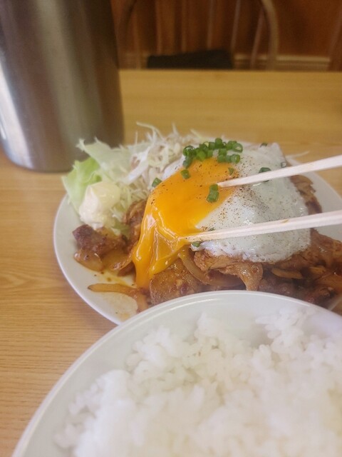 豚焼肉丼にのる目玉焼きの黄身を崩し肉に絡め喰らう(*´༥`*)ŧ‹"ŧ‹"