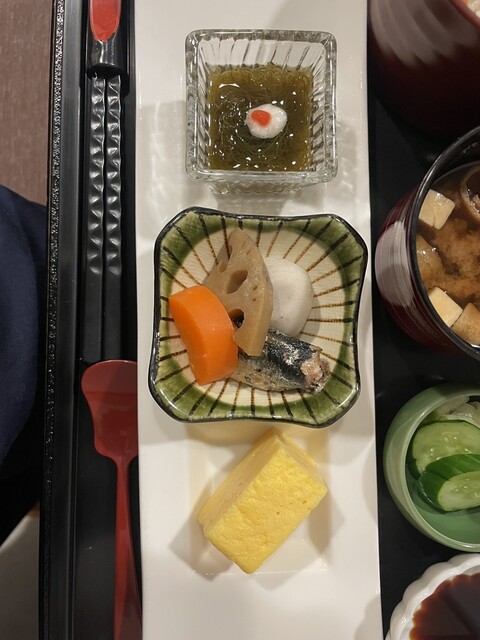 あら煮、もずく酢、煮しめ、出汁巻き玉子。