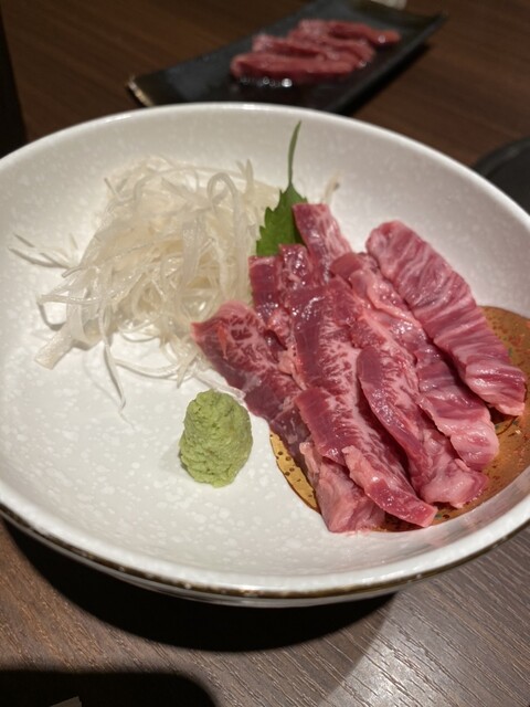 そしてメインのお肉。何度も来ていろんなお肉を頼んで辿り着いたのは結局「赤身6種盛り」。内容はハラミ・上ロース・ツラミ・カイノミ・ランプ・ウワミスジという構成。珍しい部位がそれぞれ1切れずつ入っているので、「色々食べたいけど量は少なくていい」という私のわがままにピッタリ。しかも“赤身”という言葉が付いているのに、なぜか「上ロース」「ハラミ」も含まれており、程よい脂もちゃんと楽しめるバランス感。赤身だけじゃ物足りない、少し脂も欲しい…という欲求に応えてくれます。
