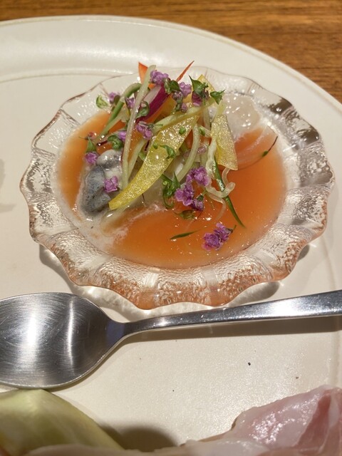 80C度で低温調理の牡蠣のガスパチョ