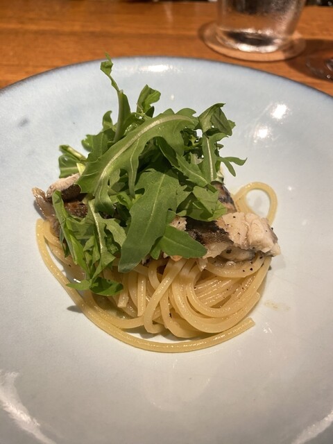 炭火焼した鮎とルッコラのパスタ