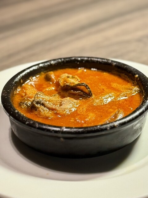 熱々で提供された牡蠣のアヒージョは、ぷりっとした食感と海の香りが口いっぱいに広がり、バゲットにオイルを浸して最後まで楽しめる一皿。
