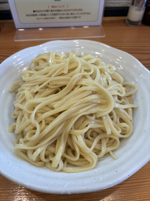 普通の煮干しスープの様なトロミは少なく、なんなら他の店の魚介豚骨や醤油豚骨より、ずっとサラッとしてます。にも関わらず、煮干しの風味(若干煮干し特有のエグ味が少ないように感じました)はしっかりしてツルモチ太麺とよく合い、僕の好みでした。つけ麺の具は、定番つけ麺と同じく、角切りチャーシューと細切りメンマ、ネギ、玉ねぎ、ほうれん草が少しずつ入ってました。