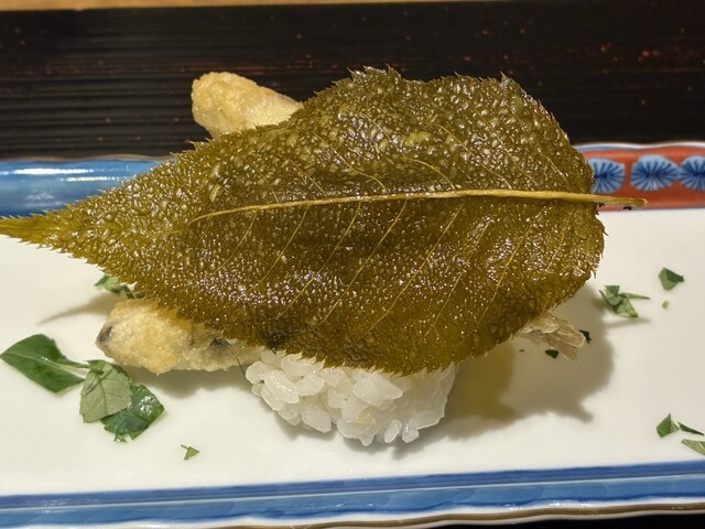 相変わらず、この店の料理は、旬を感じられて素晴らしい。今回の小鮎と桜の葉の天麩羅を蒸した餅米の上に乗せて桜の花の塩漬けをあしらえた一品は一番美味かったです。日頃、お酒入るとあまり食べない友人も美味しい美味しいとペロリとたべました。