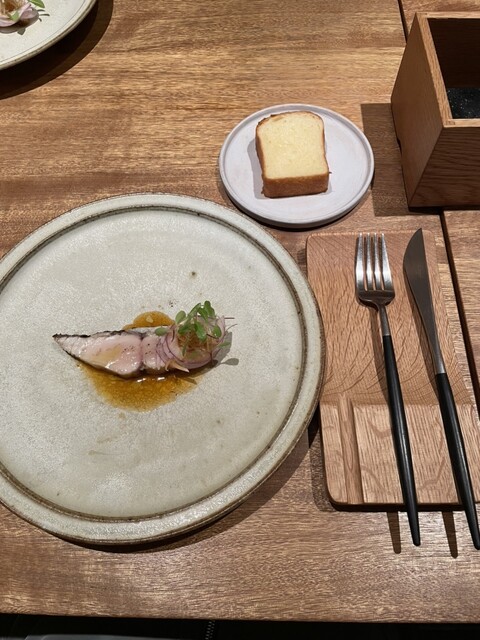 ・Pescado 焼津の梭子魚の炭火焼きスケというカタルーニャ地方のお料理で、干物のように干した後、皮目をパリっとさせていて食感も香りも楽しめます。