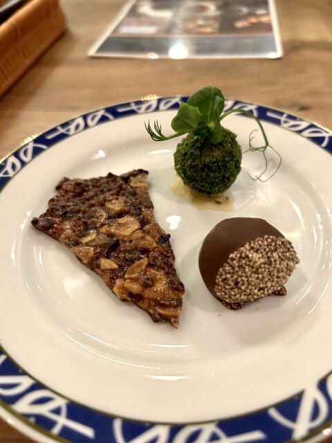 コーヒーソースとココアパウダーが味をしっかりとさせてくれますが、最もインパクトを与えてくれるのが林檎のソルベです。甘さの中に際立つ柔らかい酸味を帯びたソルベが貴重な味つけとなっています。