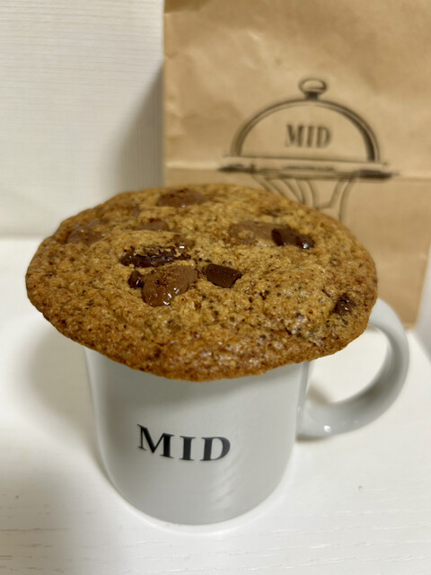 お土産に、パティシエさん超お薦めの自信作、チョコチャンククッキーを買って、お家のMIDcafeマグカップを使って(笑)美味しくいただきました。しっとりしていて、超こだわりの砂糖を使われたこのクッキー。でかいんですけど一口ですね。焦がしバターってのがいいでしょ。チョコが柔らかくてクッキーもしなやかで、この新しいテイクアウト商品にも大注目です。
