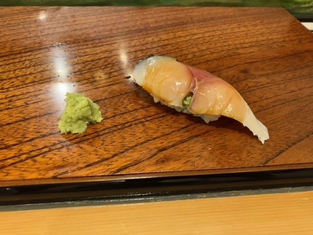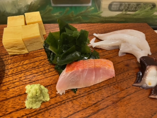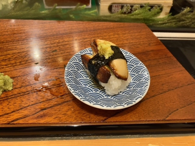 握りは中とろ、鰹、鯵、鮑、鯖(美味しかったのでお代わり)、いくら、雲丹、フォアグラ(握りは初)、縞鯵、穴子でお腹一杯。