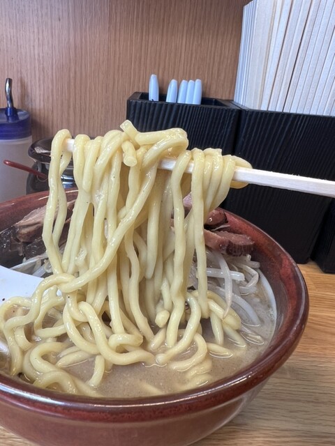 スープは口当たりがまろやかで豚骨のコクがしっかり感じられてうまうま。そしてラードで炒められたもやしがスープにちょっとずつ溶け込んでより動物の旨みが増していく..