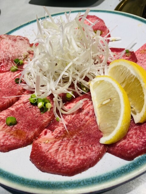 お通しダイコンサラダ(左スミ)はいつもウマ。タン塩、カルビはもっとウマ!