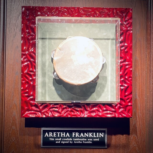 店の奥にはアレサ・フランクリンのタンバリンあり。