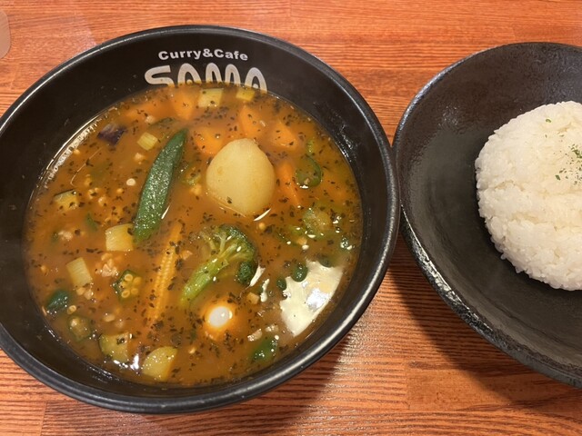 キーマ納豆カレー、海老スープ辛さ1、ライスの量普通。