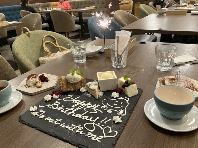 コース料理はこれで終わりですが、最後にバースデープレートを運んできてもらい、店員のお姉さんからバースデーソングを歌ってもらいました!