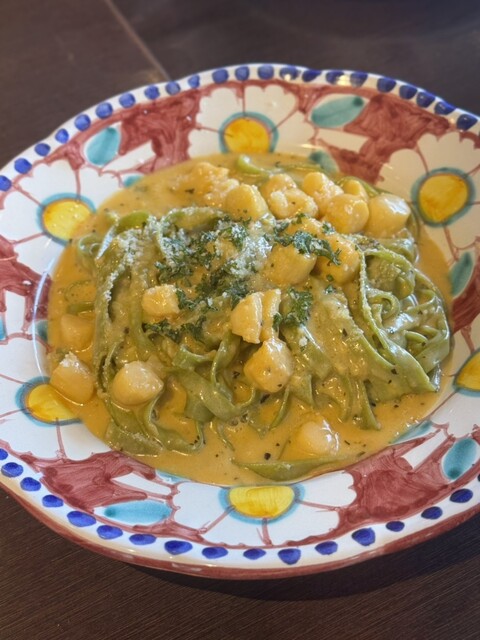 パスタはホタテとほうれん草麺のクリームパスタ。ガーリックが少々効いていてもちもち麺が絡んで美味しい。