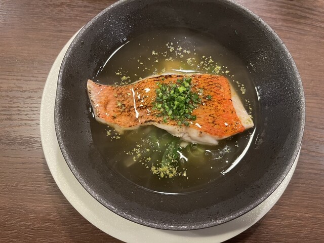 コースを注文。1品目はウニと白子の茶碗蒸し。たっぷり白子が入っていてとても贅沢。2品目は自家製ハム。お肉の甘みが強く感じられて印象に残っている。3品目は低温調理の金目鯛の昆布じめ。柑橘の風味がちょうど...