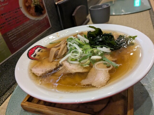 どんぶりになみなみと注がれたスープを一口啜れば、一軒目での不完全燃焼が一気に吹き飛ぶ。透き通った見た目からは想像できないほど、豚の出汁とキレのあるカエシがガツンと効いている。表面の油が旨味の蓋をしており、最後の一口まで熱々なのも嬉しい。