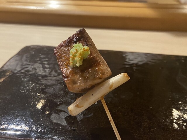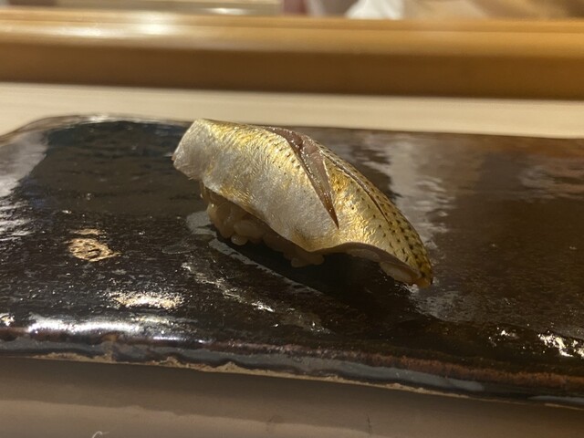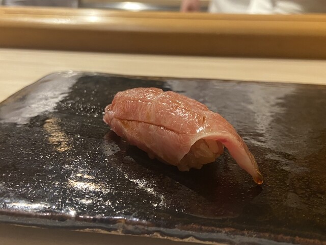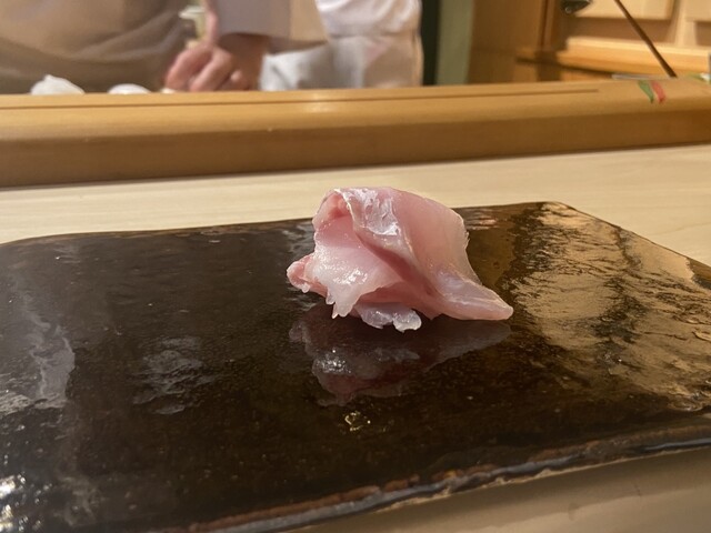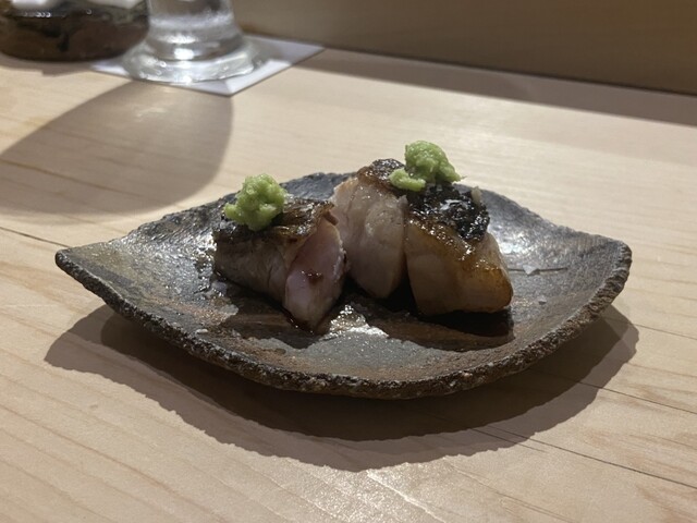 クロムツの炭焼きは表面はかりっと、身は水分を多く含みぷりぷりじゅわっと口の中で広がる旨み。炭の香りも香ばしく、このクオリティが鮨のコースの中の1品としてでてくるのか、、と感動しました。