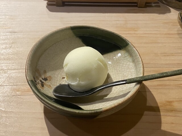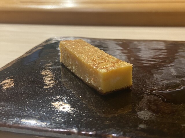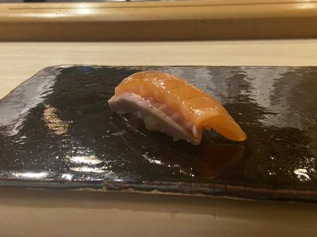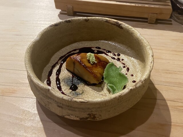 あん肝は赤ワイン1本分を1/10にまで煮詰めて作ったソースをかけて提供されます。この赤ワインソースの洋風な味わいにフレンチを思わせるような上品な1品。これも鮨のコースででてくるとは、、。あん肝の濃厚な旨みと口当たりに甘みと重厚感のあるソースが合わさって、今まで食べたことのないものでした。コースの中で1番印象に残っています。