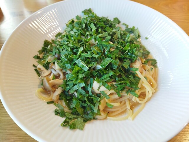 やりいかときのこの明太子パスタの大葉・水菜のせ。