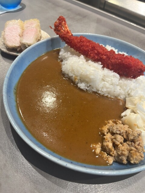 噂に聞いていた厚切りカツカレーを食べる気満々でいたのですが、メニューを開きエビフライに心惹かれ、エビフライも食べたい!厚切りカツも食べたい!でも厚切りカツ四切れにエビフライのトッピングは私の胃袋には入り切らない、、、と、プレーンに厚切りカツ2切れとエビフライってできますか??って、ややこしいお願いをしたのですが快く引き受けてくれました(*^-^)
