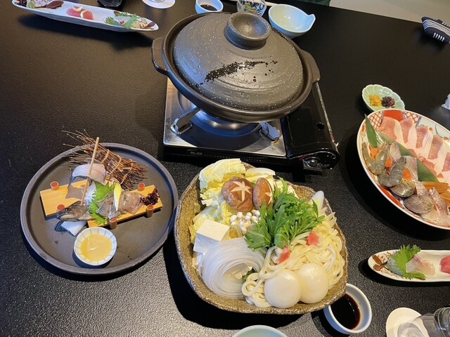 寄せ鍋は新鮮な海鮮(はまぐりやエビ、魚の切れ身など)やお肉(犬鳴きポークかな?!)です。