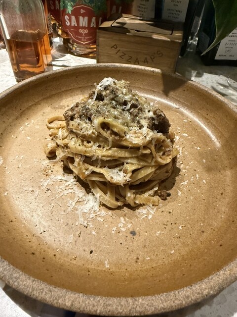 予約困難な人気店【Pizza 4P’s】。1ヶ月待ちは当たり前という盛況ぶりです!今回は「自家製プラッターのピザ」「すじ青海苔とおかひじき あさりピザ」のハーフ&ハーフや、「タリアテッレ 蝦夷鹿ボロネーゼ」などを堪能しました。ピザは薪窯で焼き上げられた香ばしさともちもち感が最高で、素材のクオリティがひと味違います。特に青海苔ピザは個性的な味わいでやみつきに。店内はおしゃれな雰囲気で、カジュアルなデートや接待にも◎。また行きたいと思わせる一軒です!