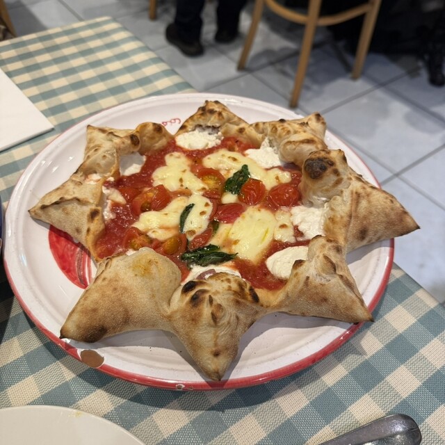 本場ナポリの味を東京で!神谷町の人気ピッツェリア「ナポリスタカ」で絶品ナポリピザを堪能!名物の星型ピザ「ドンサルヴォ」はインパクト抜群で、リコッタチーズたっぷりのもちもち生地が最高。一口食べればまるでナポリ旅行気分!イカのフリットはサクサクでジューシー、レモンを絞ると爽やかな風味が加わり、ワインとの相性も抜群。さらに、ナポリの伝統的な前菜5種盛り合わせは、シーフードや野菜がふんだんに使われていて、どれもワインが進む味わい!パスタも種類豊富で、特に魚介の旨味が凝縮されたペスカトーレは絶品。店内は陽気で本場の食堂のような賑やかさがあり、美味しいイタリアンと一緒に気分もアガる!ただし、メニューは一度しか頼めず写真もないため、事前に下調べして訪問するのがおすすめ!本場のナポリピザやイタリア料理をカジュアルに楽しみたいなら、ここは間違いなし!ワイン片手に楽しいひとときを過ごせる、リピート確実な名店!