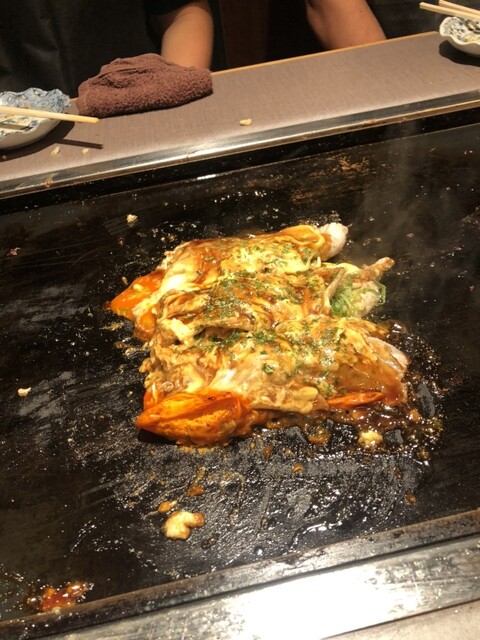 写真はとん平焼き、お通しのオムレツを焼き始めた一枚に肉味噌ピーマン。