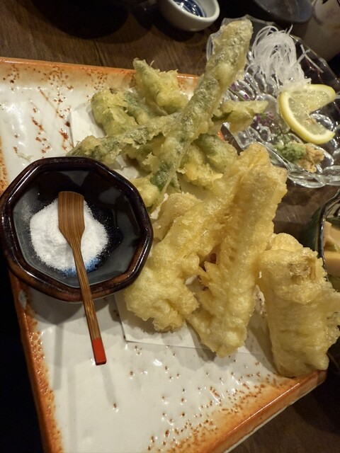 筍とアスパラの天ぷらと、どれも美しく盛りつけらたお料理でした。店員さんの雰囲気も良くカウンターともありお話しもはずみました。