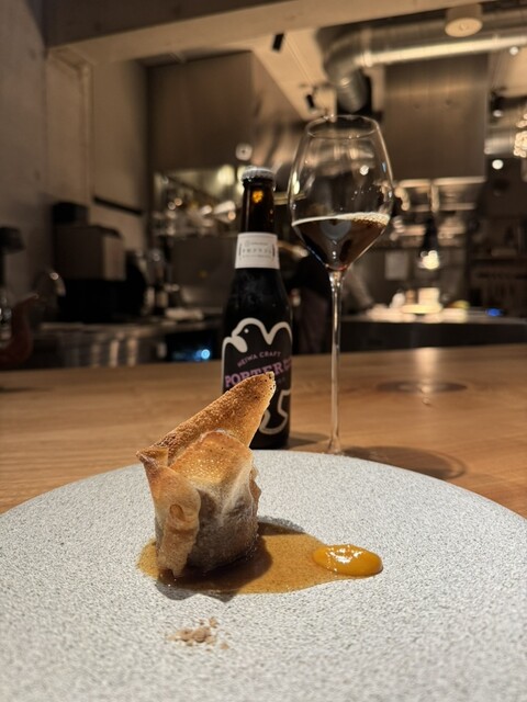 低温でじっくり煮込んだ鹿すね肉を煮凝りにし、香ばしく包み焼きした一皿。鹿の骨からとった出汁とマルサラワインの深み、アクセントの早生みかんジャムの酸味が重なり、黒ビールのほろ苦さとの相性が抜群。