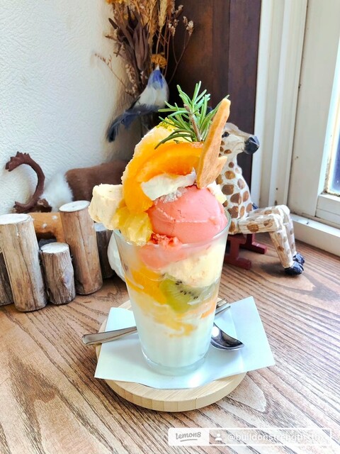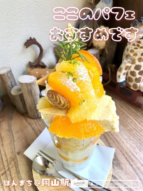 こんにちは 今日は岡山駅近くで旬のフルーツをふんだんに 入っているパフェを提供する“ほんまち”を紹介します。 今回、2回目の紹介になります。 前回は、コーヒーとパフェ(ハーフサイズ)の紹介でしたが、 今回はフルサイズをオーダーしました。 “夏みかんアールグレイのパフェ”¥1,330(税込)です。 今回は皆さまにぜひとも行っていただきたいと思い 写真を多く載せました。 今回いただいたパフェは、瀬戸内産の柑橘類を 何種も使っていて、 チーズケーキやジェラードには、ほのかな香りづけとして アールグレイが使われていました。 ジェラード、チーズケーキ、パンナコッタ、ヨーグルトは 柑橘類と相性とバランスが抜群です! 柑橘類はグラスの中にもたくさん入っていました。 キウイも入っていていいアクセントでした。 すごく丁寧に作られたパフェ すごく考えられたパフェ すごく色合いを考えたパフェ そう思えるパフェでした。 コスパはいいと思います。 岡山に行ったら可能な限り行こうと決心しました。 ぜひ 追伸 今回は出張の合間に伺いました。