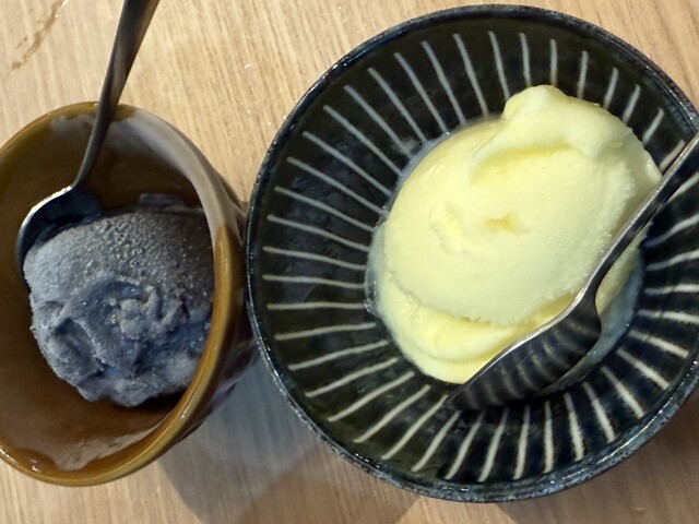 コースの締めくくりには、黒胡麻アイスとゆずシャーベットのデザート。黒胡麻アイスは濃厚な胡麻の風味がしっかりと感じられ、ゆずシャーベットは口の中をさっぱりさせてくれます。