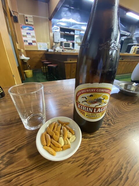 大瓶のキリンラガーとぬる燗の日本酒をちびちび。おかずをパクパク。何のことはない味ですが、まあ美味いんだな、これが。七味、醤油、マヨネーズ、辛子。アクセントもまたシンプル!