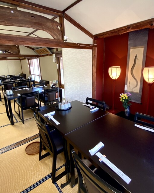 通された広間は座敷にテーブル。レトロでモダン。そこに鰻の掛け軸が。うーむ、美術館みたい(p_-)