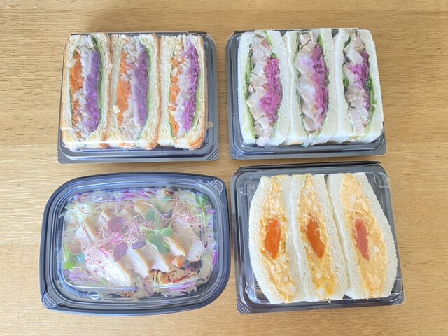 セミドライチキンサンド、ローストポークサンド、玉子サンド、それと試食させて頂いたセミドライチキンのコールスローを頂いて計4点