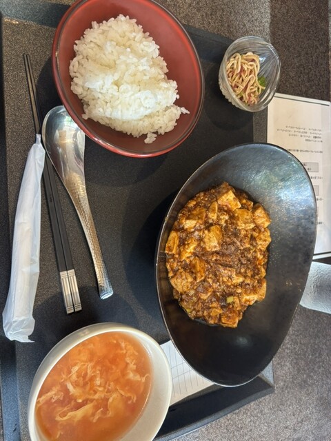 開店間近のランチ、定番の麻婆豆腐定食に舌鼓。山椒が香る本格的な味わいに、今日も大満足。곁곁のトマトスープも、滋味深く、食後の余韻まで優雅に。