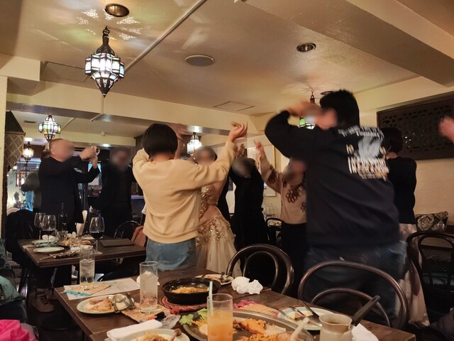 会社の飲み会で利用させて頂きました。普通の居酒屋より少し割高ですが、異国情調が楽しめ、非日常を感じられるので、たまにはこんな飲み会も有りだと思います!!料理も、モロッコの名物、タジン鍋が食べたいので、『ロイヤルサハラコース』(4500円)を選択。タジン鍋以外のスープからデザートに至るまで、全てが初めての味や見た目で、大満足です。しばらくすると、ベリーダンスショー(金・土に開催)が、幻想的な音楽の中、始まりました。最初の頃は踊り子さんが踊るのを手拍子しながら楽しんでいましたが、終盤はお客さん全員が席を立ち、踊るというカオスな状態に!!良い思い出になります。ショーが終わり、デザートを食べながら、みんなで談笑。飲み物はコーヒーかミントティーですが、コーヒーはスパイスが入ったモロッコスタイル。ミントティーも高い位置から注ぐ、こちらもモロッコスタイル。最後まで『モロッコの夜』に浸れました。一つだけ残念だったのは、飲み放題メニューにモロッコのお酒がなかった事くらいかな。それがあれば完璧でした。