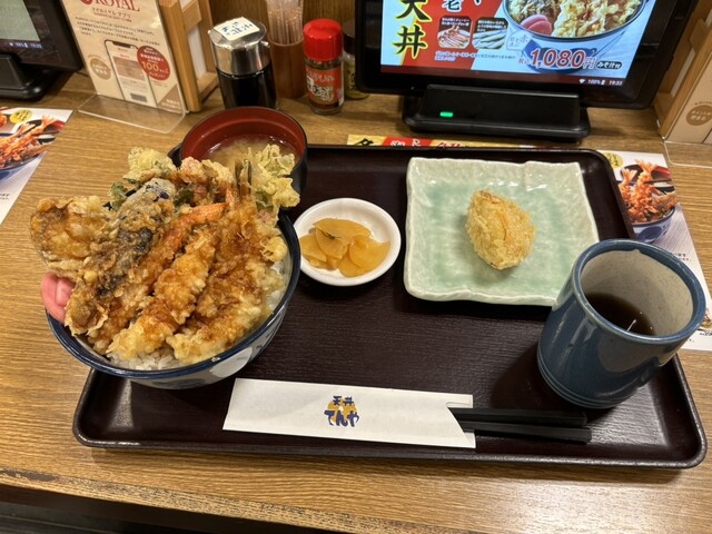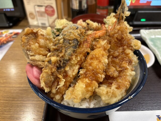 贅沢な蟹と河豚を天丼にするなんて最高