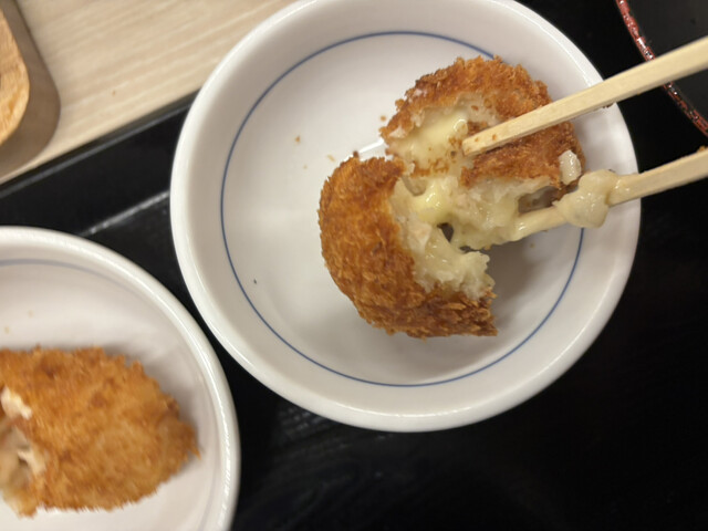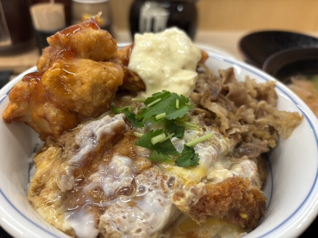 海老タレカツと親子丼の合い盛り丼、とん汁(大)、チーズコロッケ(2個)