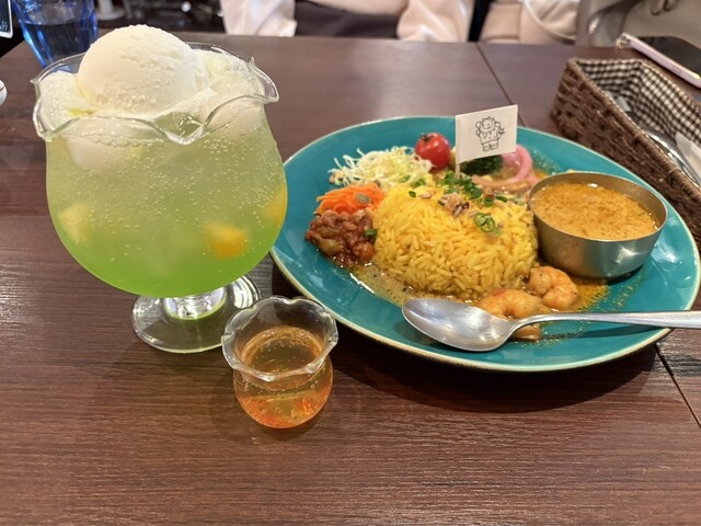 カレーはチーズキーマ、オマール海老のシーフード、スパイシーチキン、激辛スパイシーチキンがあります。オマール海老のシーフードカレーを頼みましたが、すっごく美味しいです!!大きいエビが沢山着いてきますし、カレーの中にも細かいエビが入っていて、しっかりエビの風味を感じられます♡