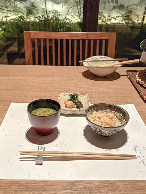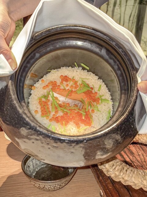 □食事 : 鮭といくらの釜炊きご飯、軸三つ葉、味噌汁香の物