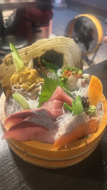 お刺身の盛り合わせは、ウニや中トロ、鯛など、どれも丁寧に切り出された逸品。