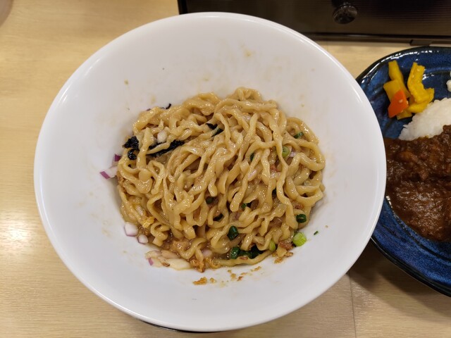 今回は海老まぜそば。カレーがキーマカレー。お豆入りキーマは食べたけど、通常のキーマはまだ食べてないので、注文。