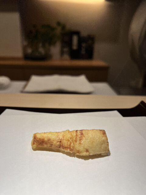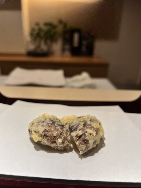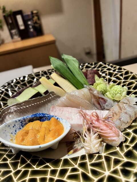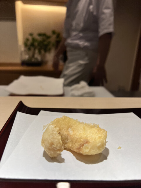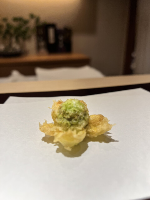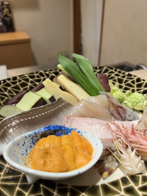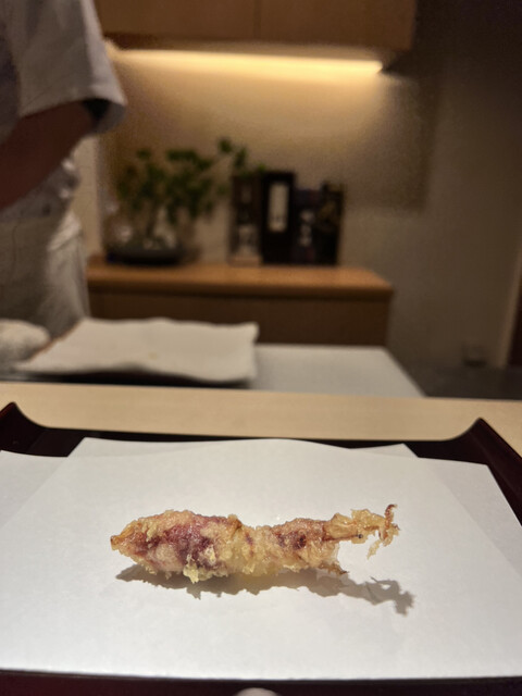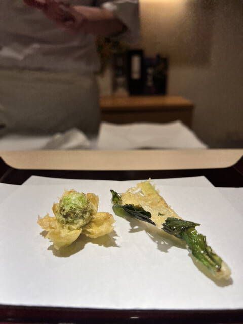 たけのこ、きす、海苔天のウニ乗せ、ホタルイカ、赤茄子、穴子