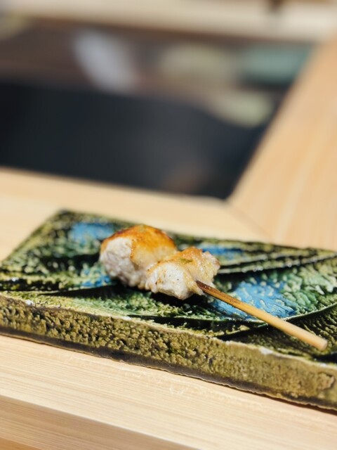 スタートは胡麻と炭の香ばしさがたまらない春野菜とせせりの一皿から。川俣シャモや熟成熊野地鶏など、旨みと火入れの妙技が光る串が続きます。特にそり身は噛むたびに広がる炭香が印象的!絶品だったのが肉詰めマッシュルーム。仕上げに削りかける香り高いキノコと濃厚なソースはワインと相性抜群で、まるでフレンチのよう。途中で登場するお吸い物も、繊細な出汁と具材の調和で、小さな和のコース料理のような趣がありました。