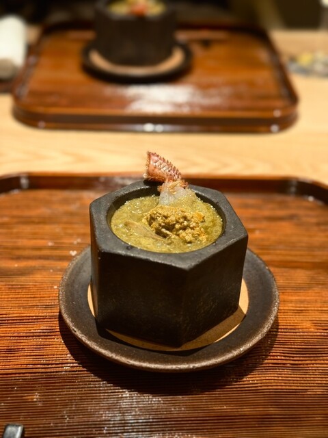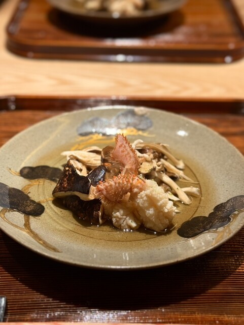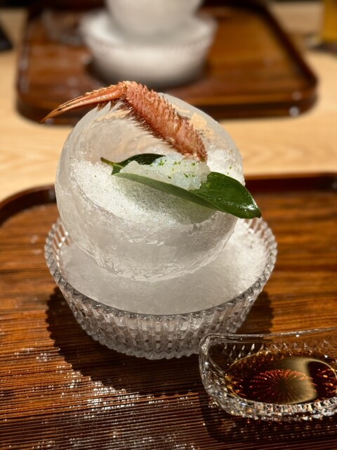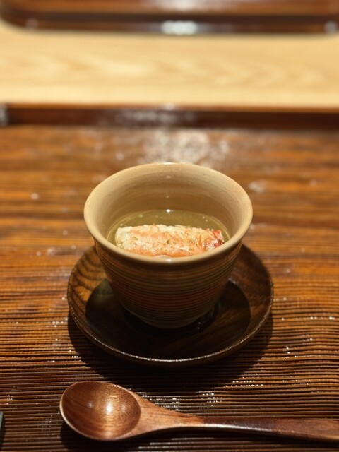 まず登場したのは、毛蟹出汁の茶碗蒸し。上にのせられた濃厚なジュレがとろけ、ふるふるとした食感と旨味の重なりがたまらない…