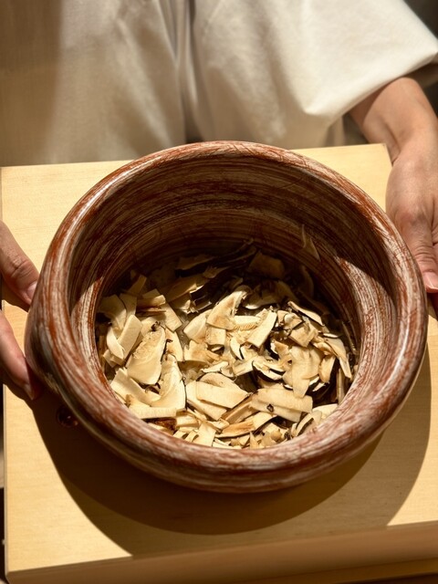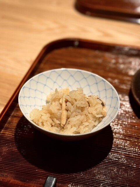 そして感動のフィナーレ「松茸ご飯」。これ自体がすでに美味しいのに、先ほどの蟹味噌を熱々のままかけると、旨味が何倍にも膨らむ贅沢な味わい。